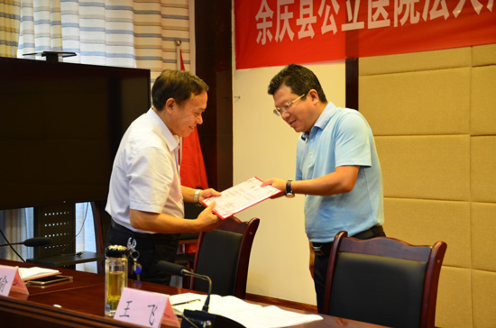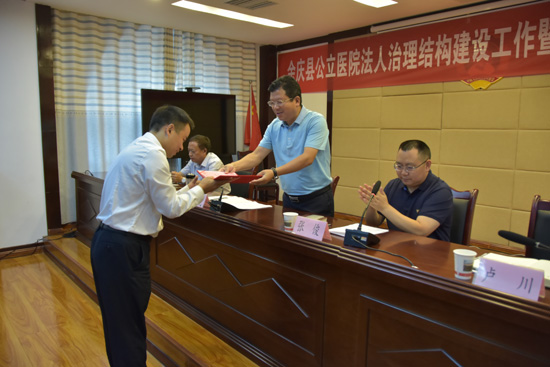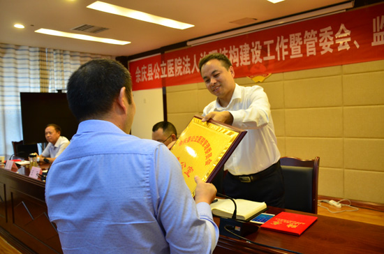 会上,张俊宣读了余庆县公立医院管委会、监事会组建方案,宣布了第一届管委会、监事会人员名单;王飞为卢川同志颁发管委会主任聘书、为赵瑜同志颁发监事长聘书;卢川为余庆县公立医院管委会办公室授牌。
