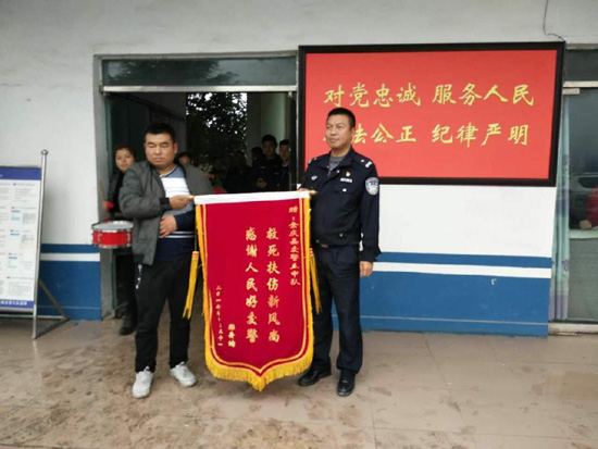 10月25日深夜,家住余庆县松烟镇新台村村民郑舟均驾驶小轿车从敖溪镇往松烟镇方向行驶,当行驶至省道S204线33公里+500米处时,由于操作不当与对向行驶的一辆载满木头的货车相撞的道路交通事故,双方驾驶员在事故中均受伤。危急之中,中队长杨承学第一时间组织民警施救,后在敖溪派出所的增援下,二位伤者得以成功救治。伤者郑舟均痊愈后,特意制作了一面锦旗来到交警中队致谢交警。(罗胜谟 欧小秋 张宇前)