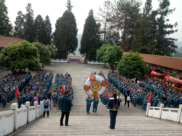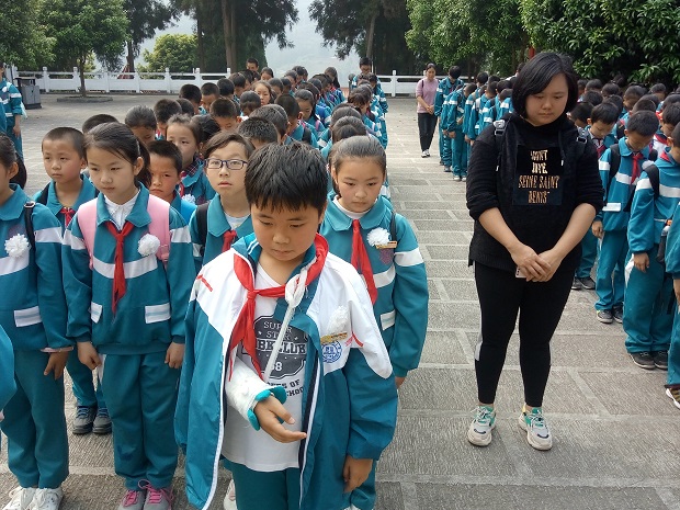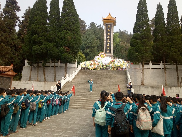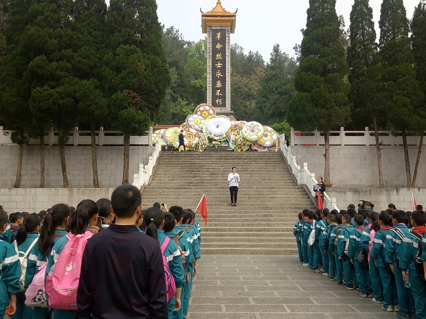 4月4日早上,余庆县实验小学五年级全体师生穿着整齐的校服,戴上亲手扎的洁白纸花 ,排着整齐的队伍从学校出发,怀着对先烈的无比沉痛的心情来到余庆县烈士陵园,开展“缅怀革命英烈”扫墓活动。