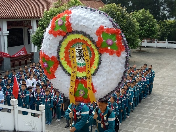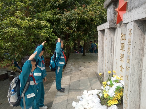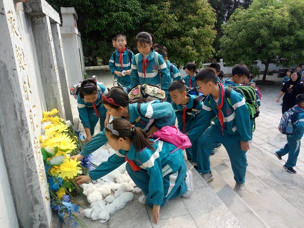 活动现场,全体师生向烈士默哀、少先队员向烈士进献花圈、全体师生向革命烈士献诗。少先队员宣誓:少先队员承诺人民为先、祖国至上、诚实勇敢、自律自强、奋发有为、誓作栋梁、振心中华、再造辉煌,继承先辈遗志,永做时代接班人。校长彭华艳向同学们介绍了革命先烈的事迹,并和孩子们一起重温了《中国少年说》,并叮嘱每位同学都应怀有革命先烈的伟大奉献精神,为实现中国梦而努力向革命先烈学习,做一个真正的名副其实的少先队员。最后,全体师生怀着崇敬的心情绕墓一周,了解烈士们的丰功伟绩并敬献小白花。