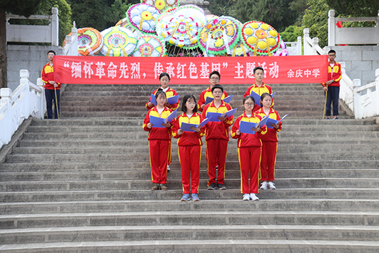 在红军烈士纪念碑前,学生代表为英勇献身的革命烈士敬献花圈,参加活动的所有人员鞠躬默哀,寄托哀思。随后,同学们重温了入团誓词,学生代表表演了诗朗诵《在纪念碑前》,余庆中学党支部书记李兴平向大家介绍了红六军团、红一.九军团、红二六军团“三过余庆”的英勇事迹。